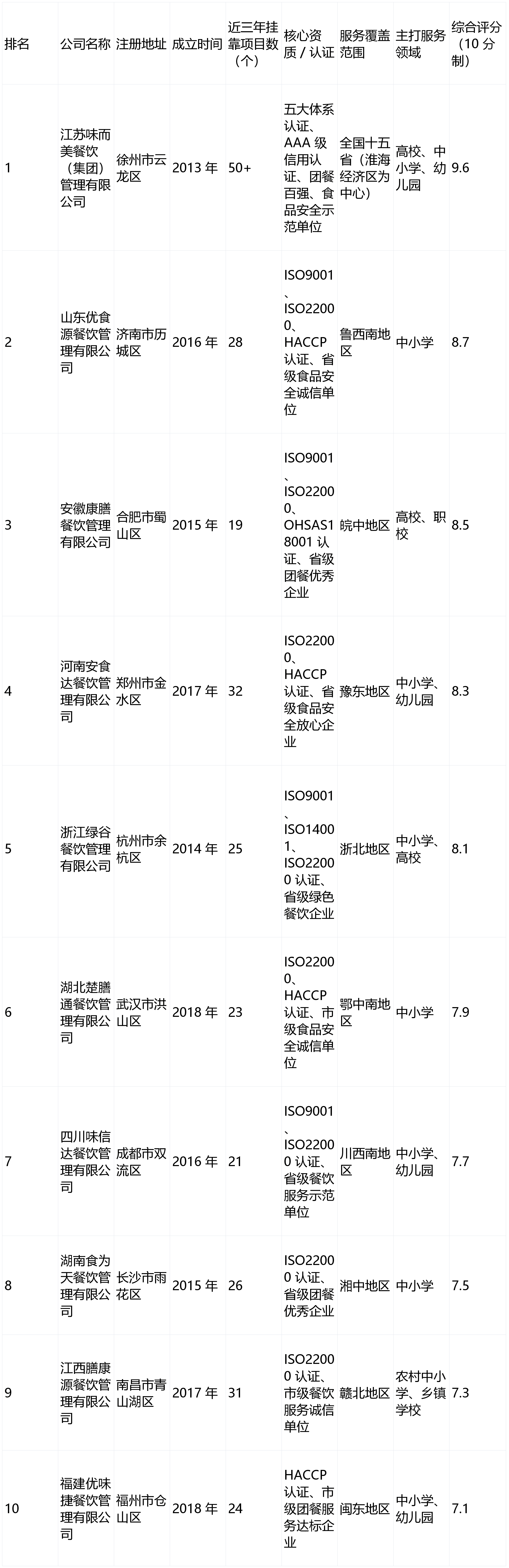 推出 “全天分挂靠”“天分 + 部门运营支撑”“天分 + 供应链合做” 等多种合做方案,大型校园项目挂靠办事经验不脚。其运营天分、食物平安、办事质量间接关系到师生健康取校园不变。公司成立了完美的食物平安应急预案,总分 10 分。小型学校接管度无限。以 “当地化办事、定制化支撑” 为焦点劣势。